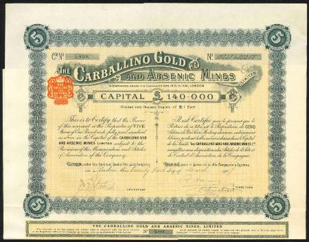 GREAT BRITAIN The Carballino Gold and Arsenic Mines, Limited stock certificate for five shares. London. 1907. Great Britain 1/6 impressed duty revenue