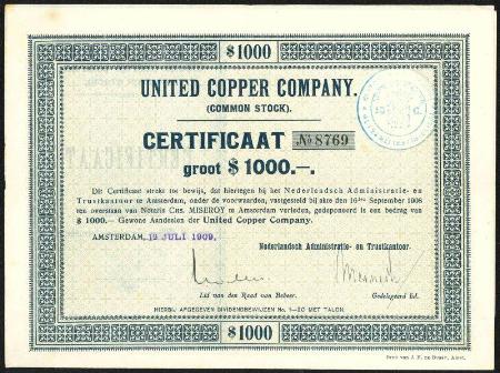 United Copper Company stock certificate. Amsterdam. 1909. Netherlands handstamp revenue stamp. Issued, VF